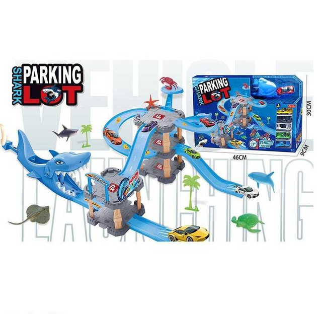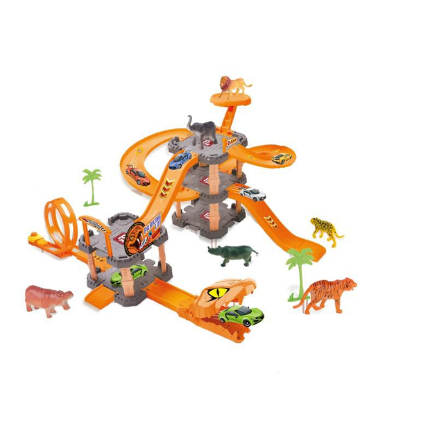 Трек 8864 3 рівні, 6 металопластикових машинок, механічний запускач, фігурки тварин, у коробці