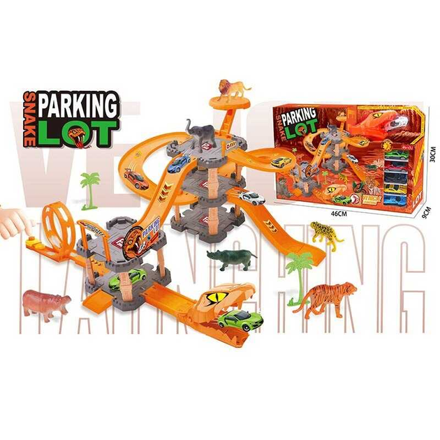 Трек 8865 3 рівні, 6 металопластикових машинок, механічний запускач, фігурки тварин, у коробці