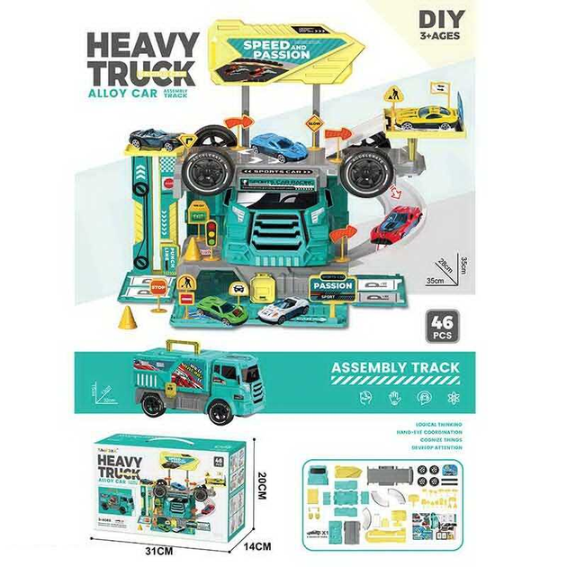 Трек 6665 (36/2) 46 елементів, складається у вантажівку, металопластикова машинка, механічний ліфт, наліпки, в коробці