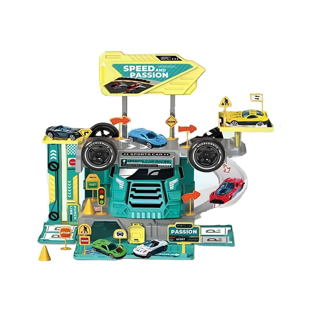 Трек 666-15 6 металопластикових машинок, гелікоптер, 3 рівні, муляжі оточення, наліпки, в коробці