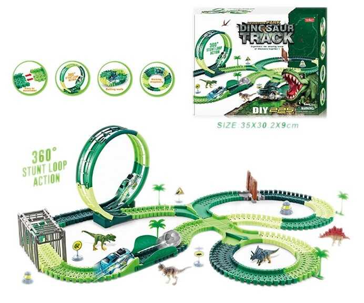 Трек 358 (18/2) 225 деталі, машинка на батарейках, підсвічування, 4 фігурки динозаврів, в коробці
