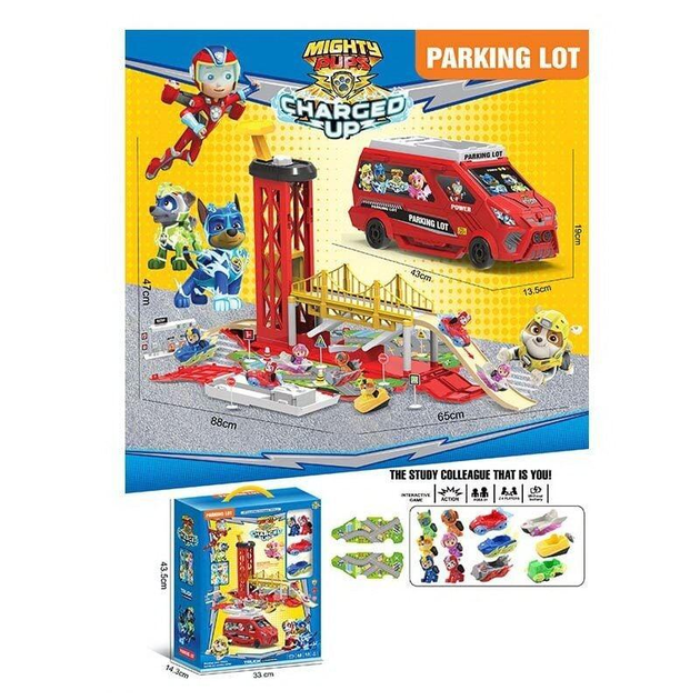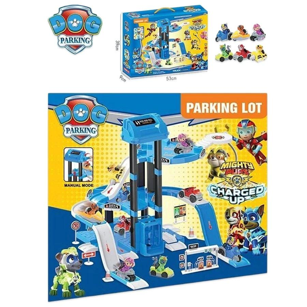 Трек 111-37 A (18/2) парковка, кілька поверхів, автоматичний підіймач, світло, звукові ефекти, слова англійською, 2 щеняти,