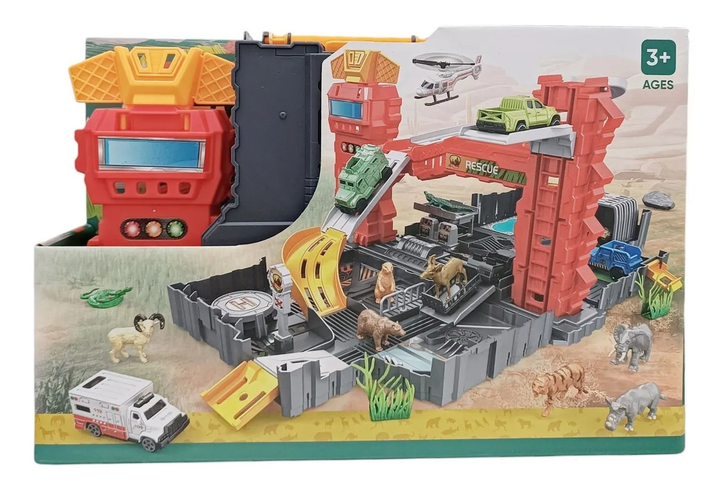 Трек паркінга для машинок у валізі з машинками та фігурками тварин