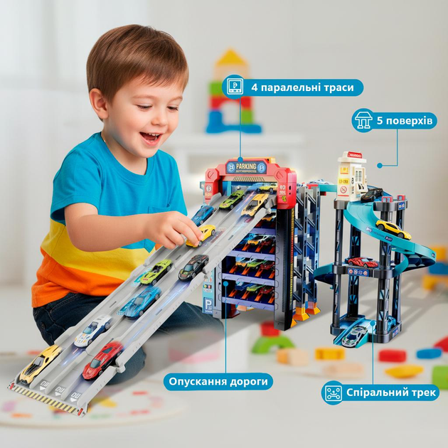Трек-паркінг дитячий 5 рівнів з підсвіткою та музикою, 4 траси, автоматичний запуск, 8 машинок, T 935 A