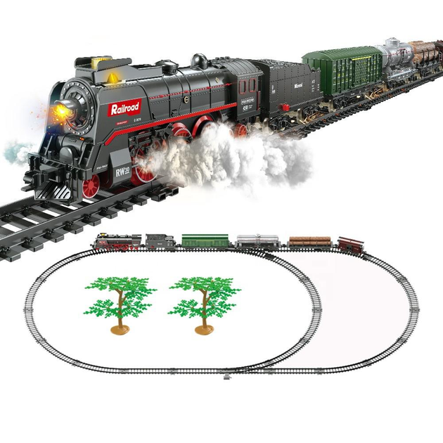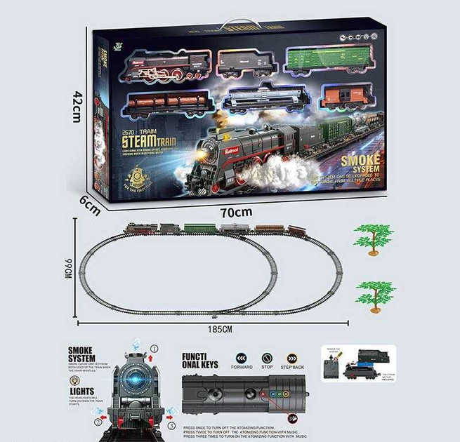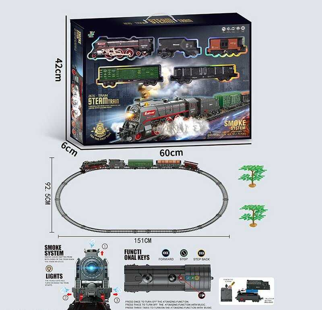 Залізниця 602 B 5 вагонів довжиною 93см, дорога 99х138 см, підсвічування, парогенерація, звук-беззвучний режим, рух вперед-н