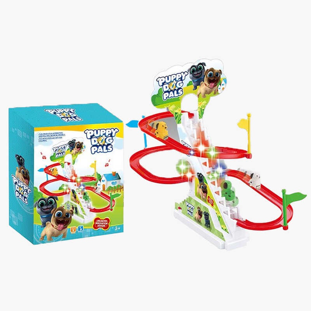 Трек 111-37 A (18/2) парковка, кілька поверхів, автоматичний підіймач, світло, звукові ефекти, слова англійською, 2 щеняти,