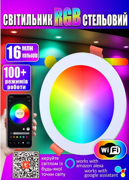 RGB + ССТ світлодіодний точковий розумний світильник LED. Круглий вбудований стельовий WiFi світильник Tuya Smart з регулюва