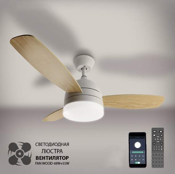 Люстра світлодіодна з вентилятором LUMINARIA FAN WOOD 48W+18W R-APP-1060x390 WHITE 220V IP20 з пультом ДУ