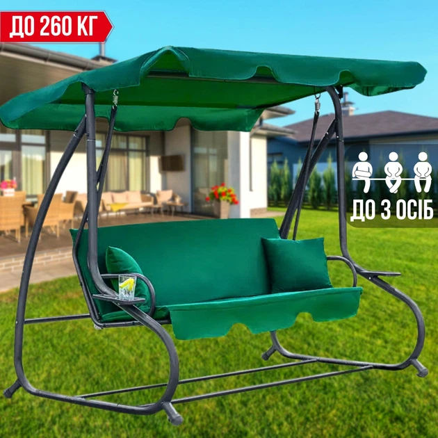 Розкладна Садова Гойдалка - Диван 3-місна до 260 кг c Підсклянниками Зелена King Garden Plus + 2 подушки