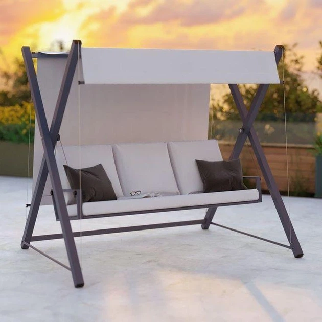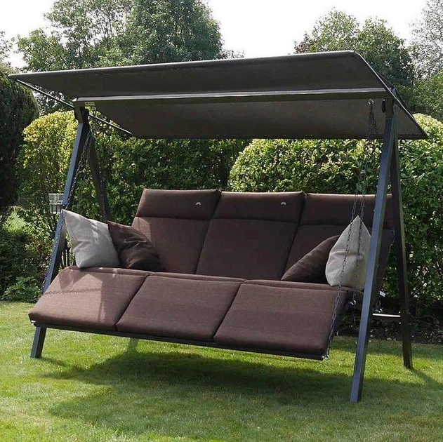 Тримісна садова гойдалка з м'якими подушками та стійким металевим каркасом та регульованим козирком до 200 кг LEOBRO для тер