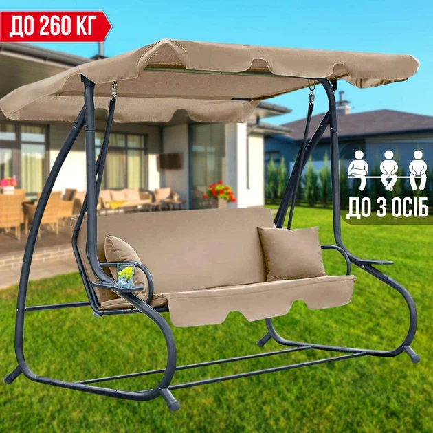 Розкладна Садова Гойдалка - Диван 3-місна до 260 кг c Підсклянниками Бежева King Garden Plus + 2 подушки