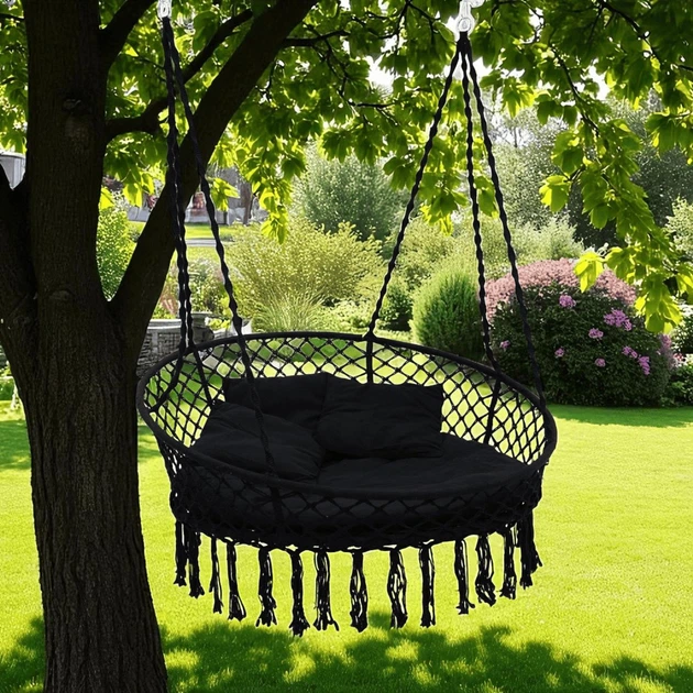 Велика кругла гойдалка підвісна 140 см із подушкою WCG Велике плетене крісло кругле + м’яка подушка Чорний