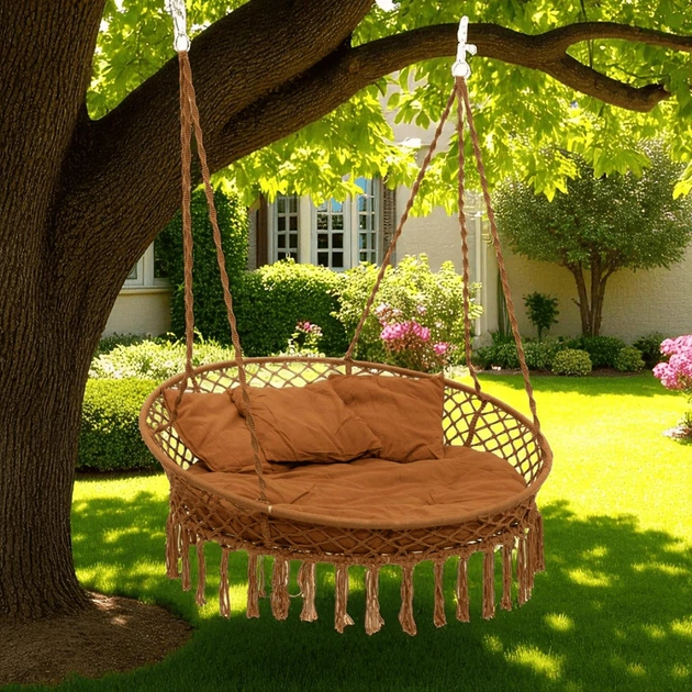 Велика кругла гойдалка підвісна 140 см із подушкою WCG Велике плетене крісло кругле + м’яка подушка Коричневий