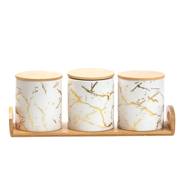 Набір 3 шт. керамічних банок 650 мл з бамбуковими кришками та мармуровим принтом Sugar, Tea, Coffee білий 304-945