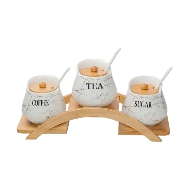Набір 3 керамічні банки Золотой Волан 650мл з бамбуковими кришками, білий мармур з золотом (BD-304-945)