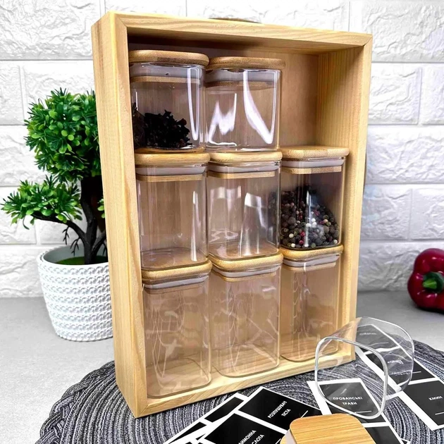 Набір скляних ємностей для спецій у дерев'яному боксі + наклейки, 10 предметів