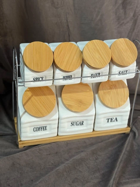 Набір банок для сипучих продуктів Yiwu HP-6731 на металевій підставці 300/700 мл 8 предметів Білий