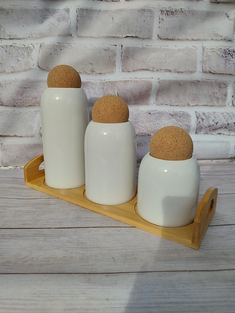 Набір банок для сипучих продуктів TS Kitchen HP250 кераміка з дерев'яною пробкою та підставкою 23 см 18 см 13 см Білий