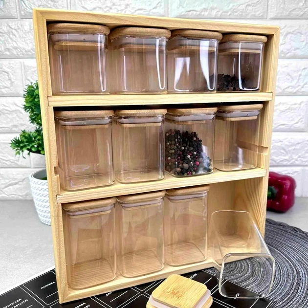 Великий набір скляних ємностей для спецій у дерев'яному боксі + наклейки, 13 предметів