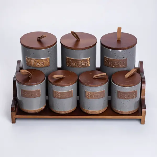 Набір банок для сипучих продуктів 7 штук по 300 мл на бамбуковій підставці, сірий(HP-26-2G)(WB)