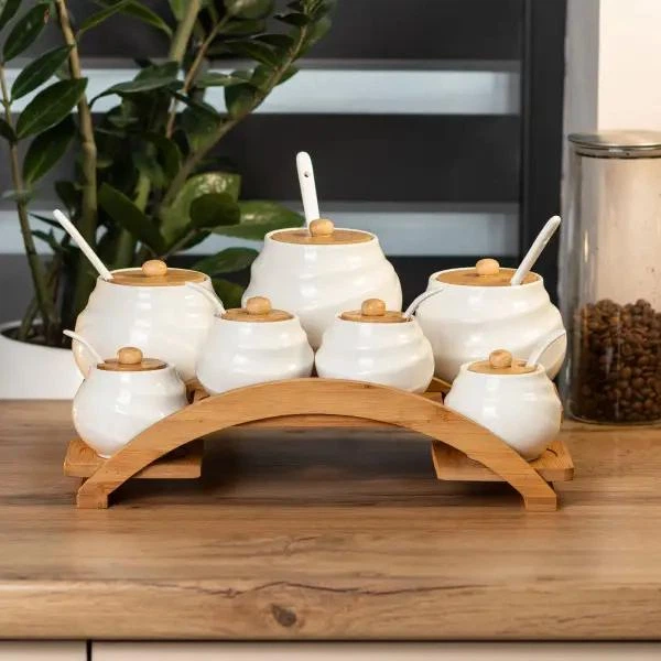 Набір керамічних банок з ложечками 500/200 мл для сипучих продуктів 7 штук з бамбуковими кришками та підставкою для організа