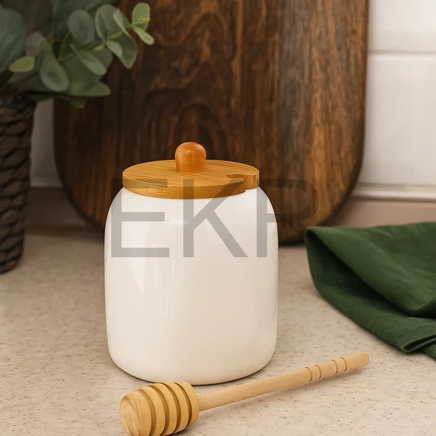 Медівниця з фарфору 380 мл з бамбуковою кришкою та ложкою — біла баночка для меду (938-031)