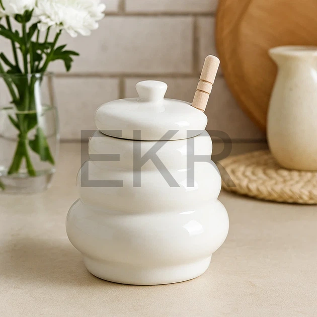 Медівниця з фарфору з дерев'яною ложкою 400 мл — біла баночка для меду (938-010)