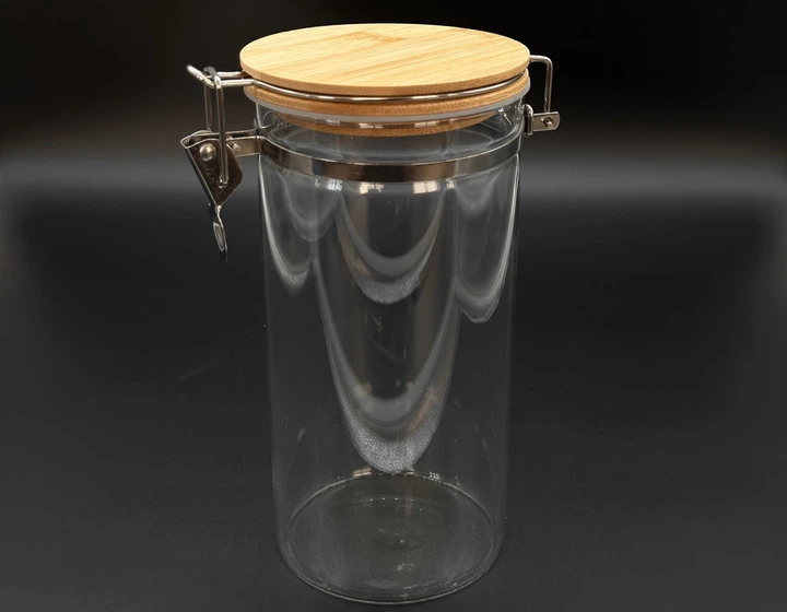 Ємність для зберігання сипучих продуктів скляна з дерев'яною кришкою і засувкою 20 х 10 см Прозорий (BUL-21)
