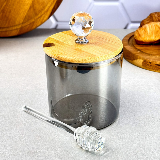 Скляна банка для меду 550 мл зі скляною паличкою Smokey Crystal