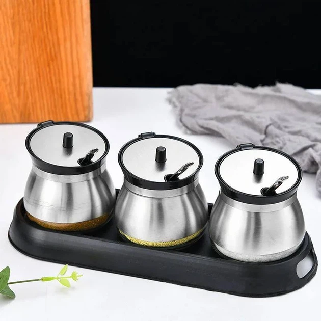 Набір вазочок для сипучих з кришками і ложками з підставкою скляні