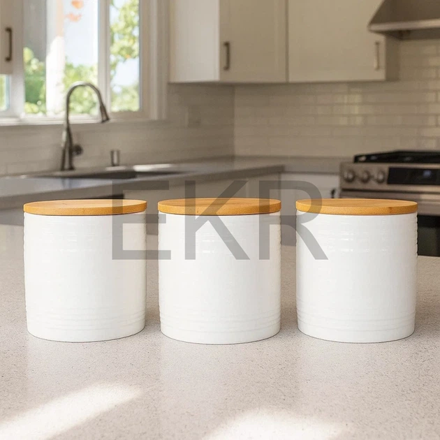 Набір з 3-х керамічних банок (430 мл) з бамбуковими кришками та об'ємним малюнком "Лінії", Білі (304-904)