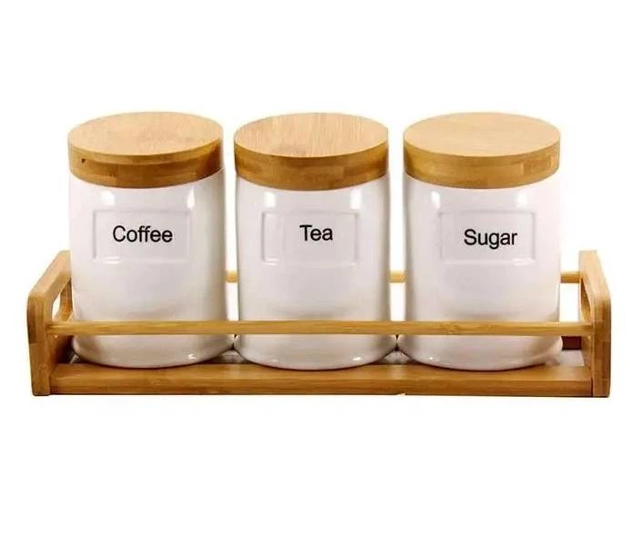 Набір банок 3 шт. фарфорових на підставці 600 мл з дерев'яною кришкою Interos PJ01783