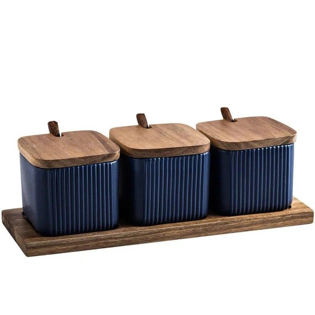 Набір вазочок 3 шт для сипучих з кришками та ложками на бамбуковому підносі Сині