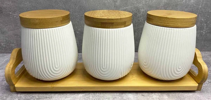 Набір 3-х фарфорових банок на дерев'яній підставці 600 мл Interos PJ03430-S