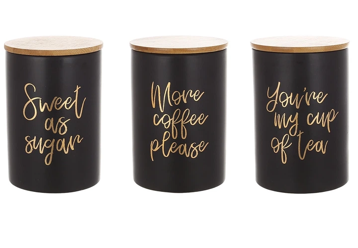 Набір керамічних банок з бамбуковими кришками із золотим написом чорний матовий 10*10*14.7 см 800 мл 3 шт. 304-019
