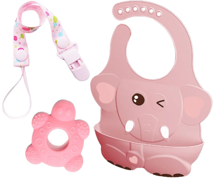 Набір слинявчик силіконовий прорізувач для зубів зі стрічкою тримачем фіксатором Рожевий n-12514