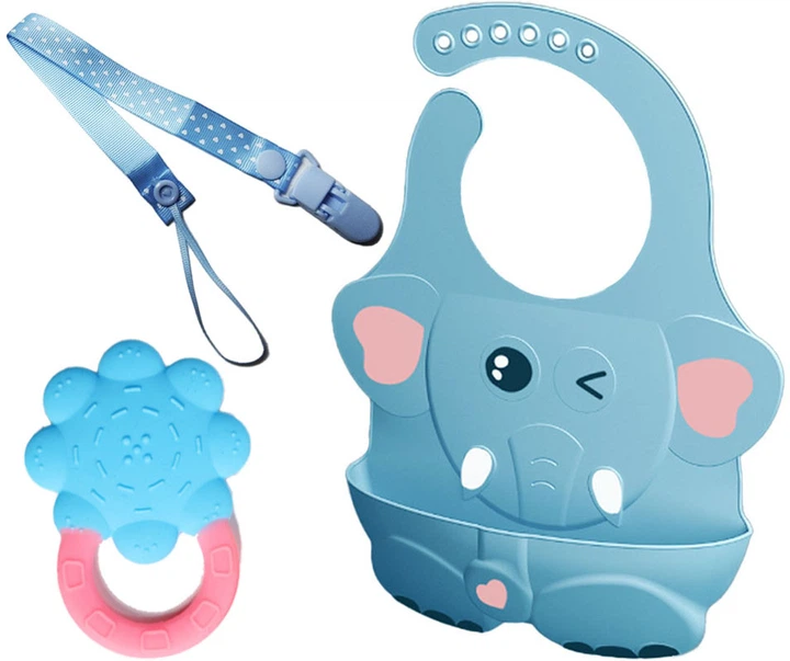 Набір силіконовий слинявчик слон прорізувач для зубів жираф зі стрічкою тримачем фіксатором Синій n-1251