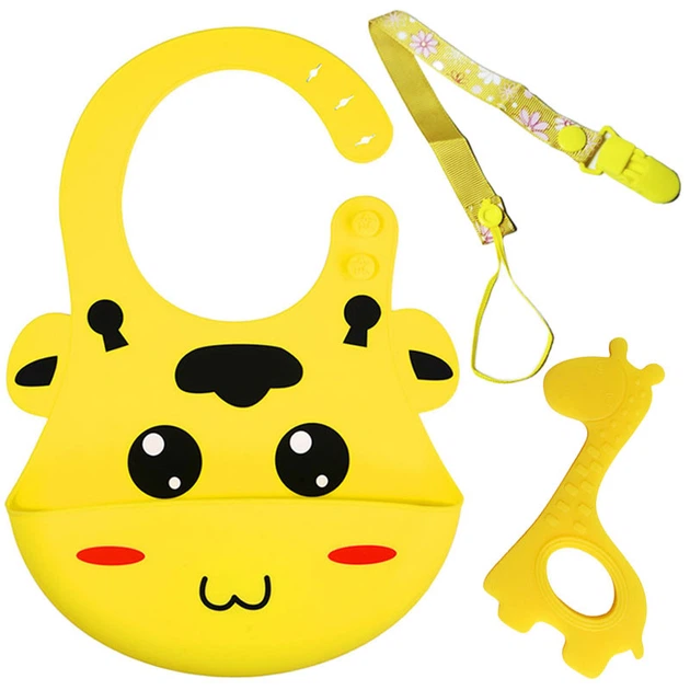 Набір слинявчик силіконовий прорізувач для зубів зі стрічкою тримачем фіксатором Жовтий Жирафчик v-12510