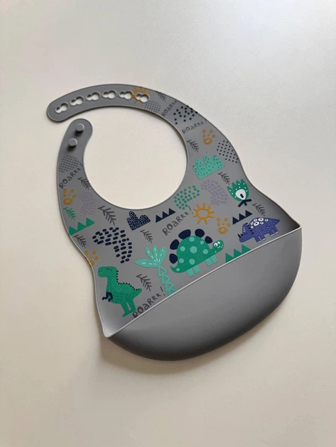 Силіконовий слюнявчик з принтом, дитячий силіконовий нагрудник Динозаври Темно сіри