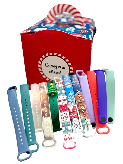 Комплект святкових різдвяних та новорічних силіконових ремінців для Mi Band 3/4/5/6/7 у подарунковій упаковці (12 шт) (mrk29