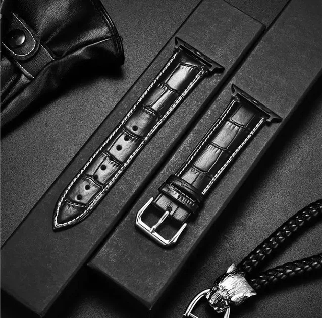 Шкіряний ремінець для Apple Watch 38/40/41 Чорний з тисненням / Чорне кріплення