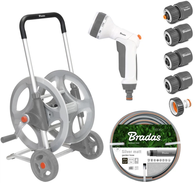 Металевий візок зі шлангом Bradas 1/2" 20м та аксесуарами, комплект для поливу, SILVER PRO SET, WHITE LINE, WL-AG33320SET1