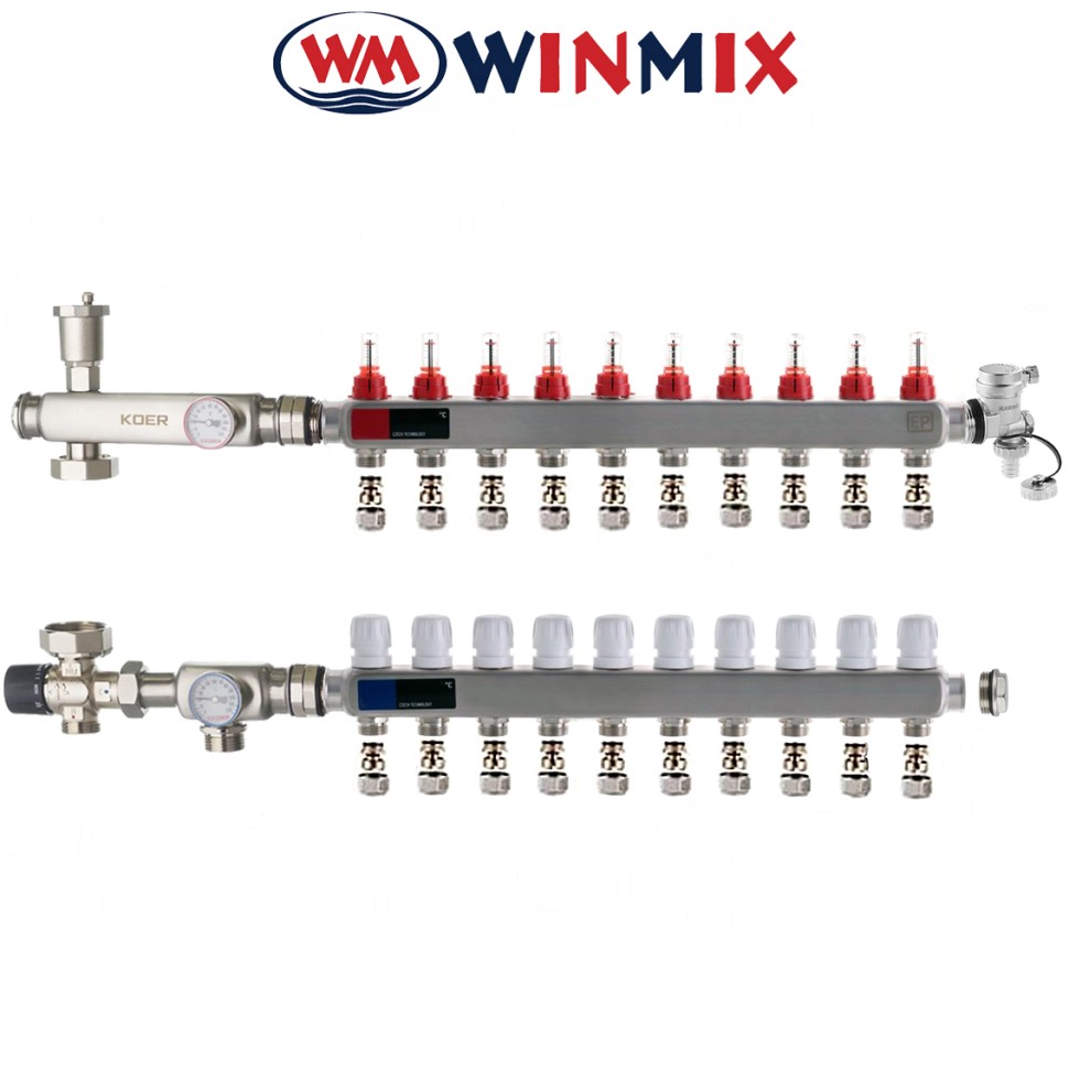 Колектор Winmix для системи "ТЕПЛА ПІДЛОГА" з витратомірами 10 виходів. Центральним вузлом для керування та регулювання опалювальної підлогової системи є колекторна група. Вона складається з колектора, витратоміру, запірної арматури, фільтра грубого очищення, терморегулятора. Корпус пристрою виготовлений з нержавіючої сталі, стійкий до агресивного середовища. З усіма супутніми