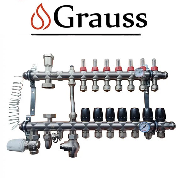 Коллекторный узел в сборе 1012-07 Grauss для системы "ТЕПЛЫЙ ПОЛ" на 7 выходов с нижним подключением из нержавеющей стали (Ч