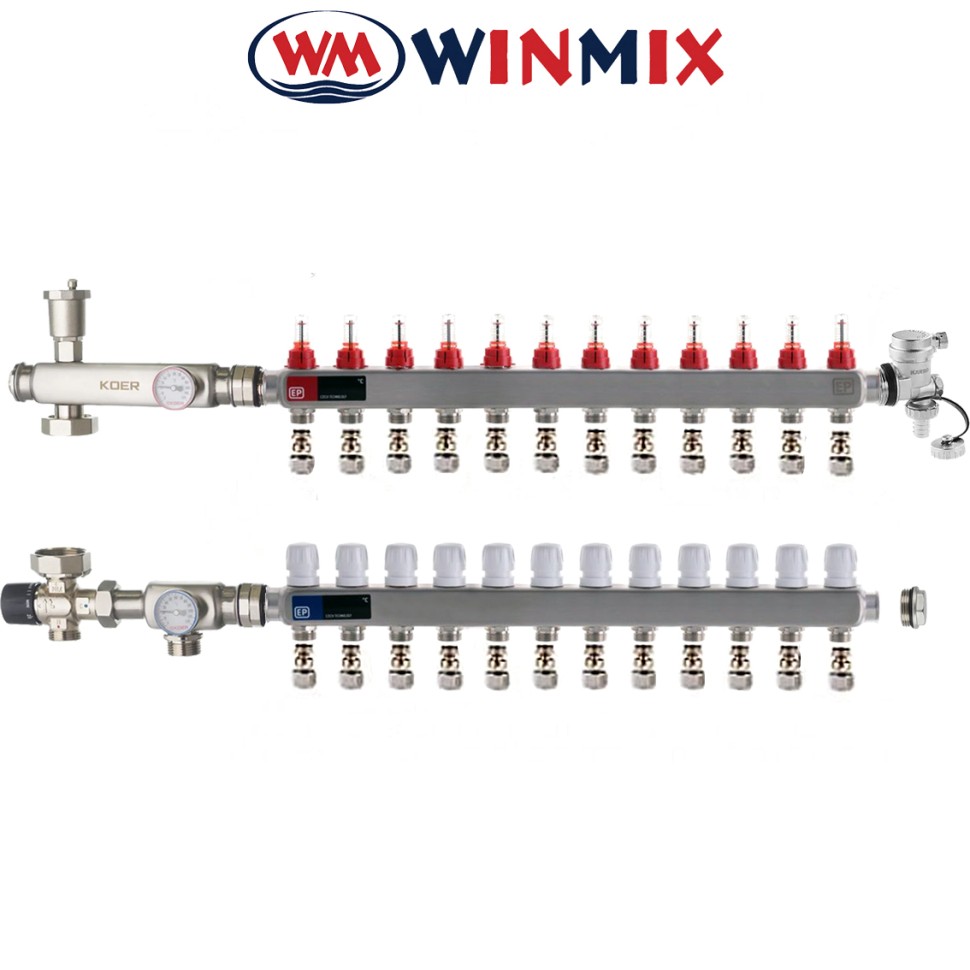 Коллекторный узел в сборе с термостатическим смесит. клапаном для системы "ТЕПЛЫЙ ПОЛ" WInmix на 12 выходов (нержавеющая ста