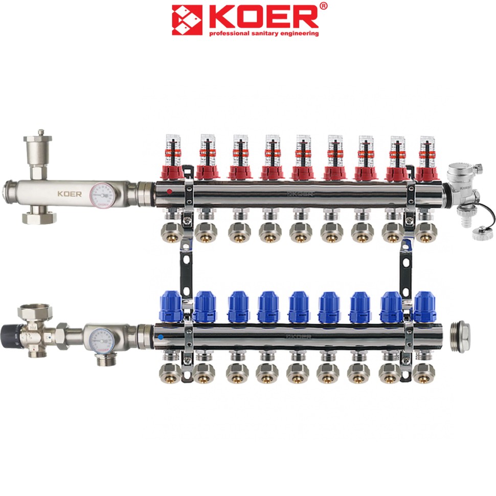 Коллекторный узел в сборе с с термостатическим смесит. клапаном для системы "ТЕПЛЫЙ ПОЛ" на 9 выходов KOER с подключением к