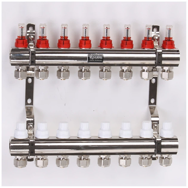 Колектор ROSSINI з витратомірами, термоклапанами і евроконусами 1"x3/4" 8 виходів