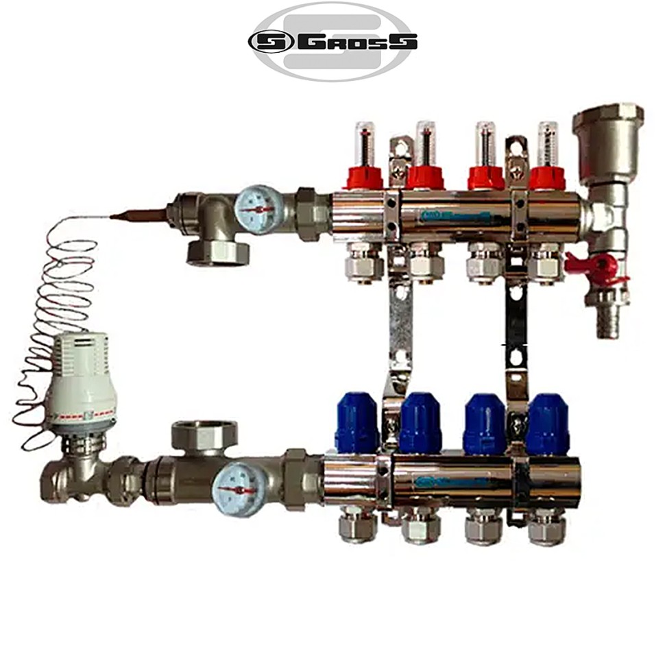 Коллекторный узел в сборе для системы "ТЕПЛЫЙ ПОЛ" GROSS на 4 выхода (Германия)