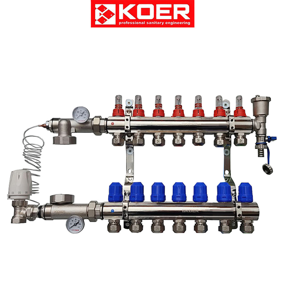 Все продукция торговой марки "KOER" производится на новейшем оборудовании Чешского завода "Dieffenbacher-cz". Приобретая товар торговой марки "КОЕР" Чехия, вы получите высокое качество по приемлемой цене. Коллекторный узел в сборе KOER для системы "ТЕПЛЫЙ ПОЛ" с расходомерами, насосной группой, сливной группой, краном с термоголовкой на 7 выходов. Коллектор представляет собой латунные