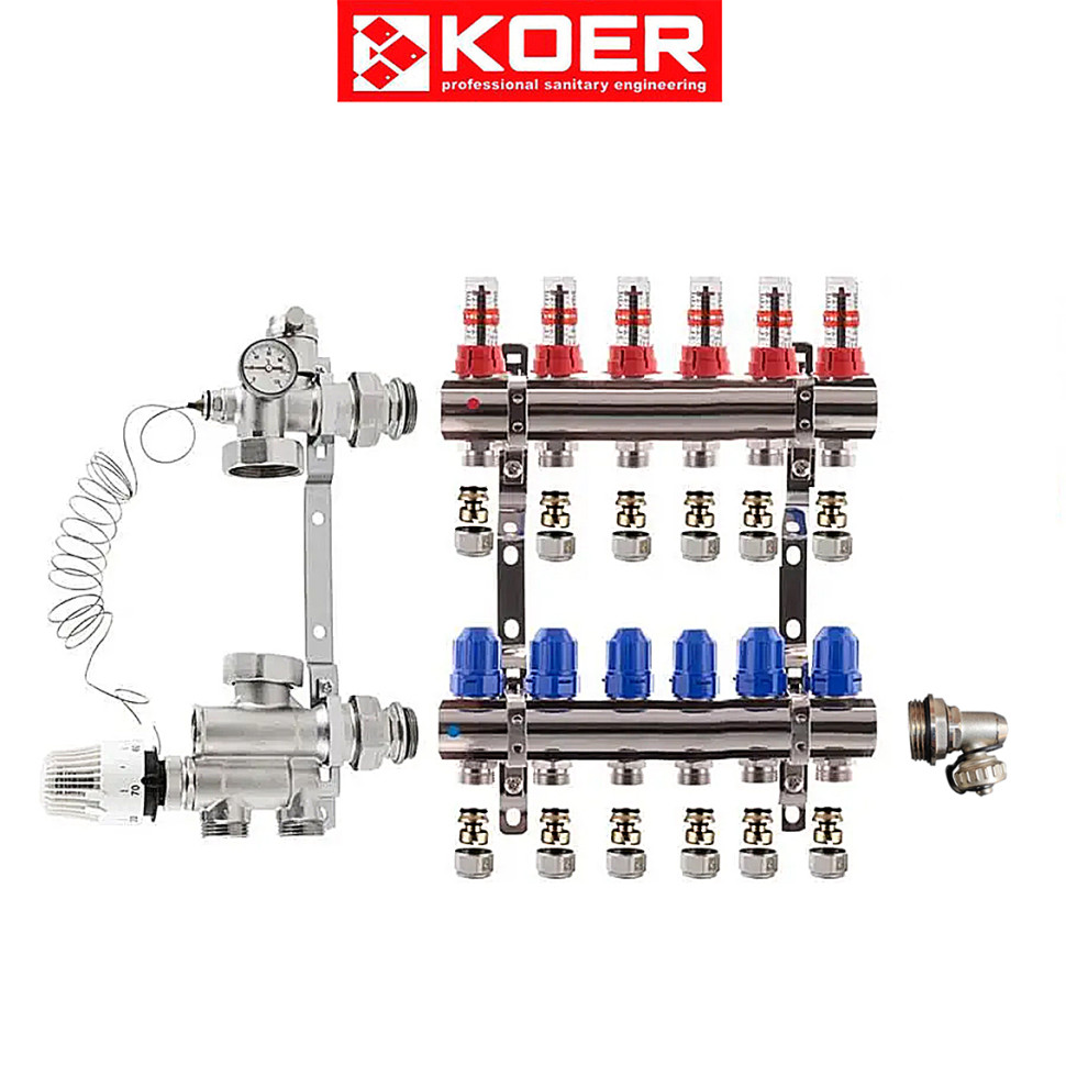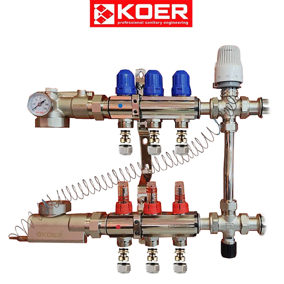 Все продукция торговой марки "KOER" производится на новейшем оборудовании Чешского завода "Dieffenbacher-cz". Приобретая товар торговой марки "КОЕР" Чехия, вы получите высокое качество по приемлемой цене. Коллектор KOER для системы "ТЕПЛЫЙ ПОЛ" с термостатическими клапанами, без расходомеров. Коллектор для теплого пола турецкой фирмы KOER. Коллектор представляет собой латунные
